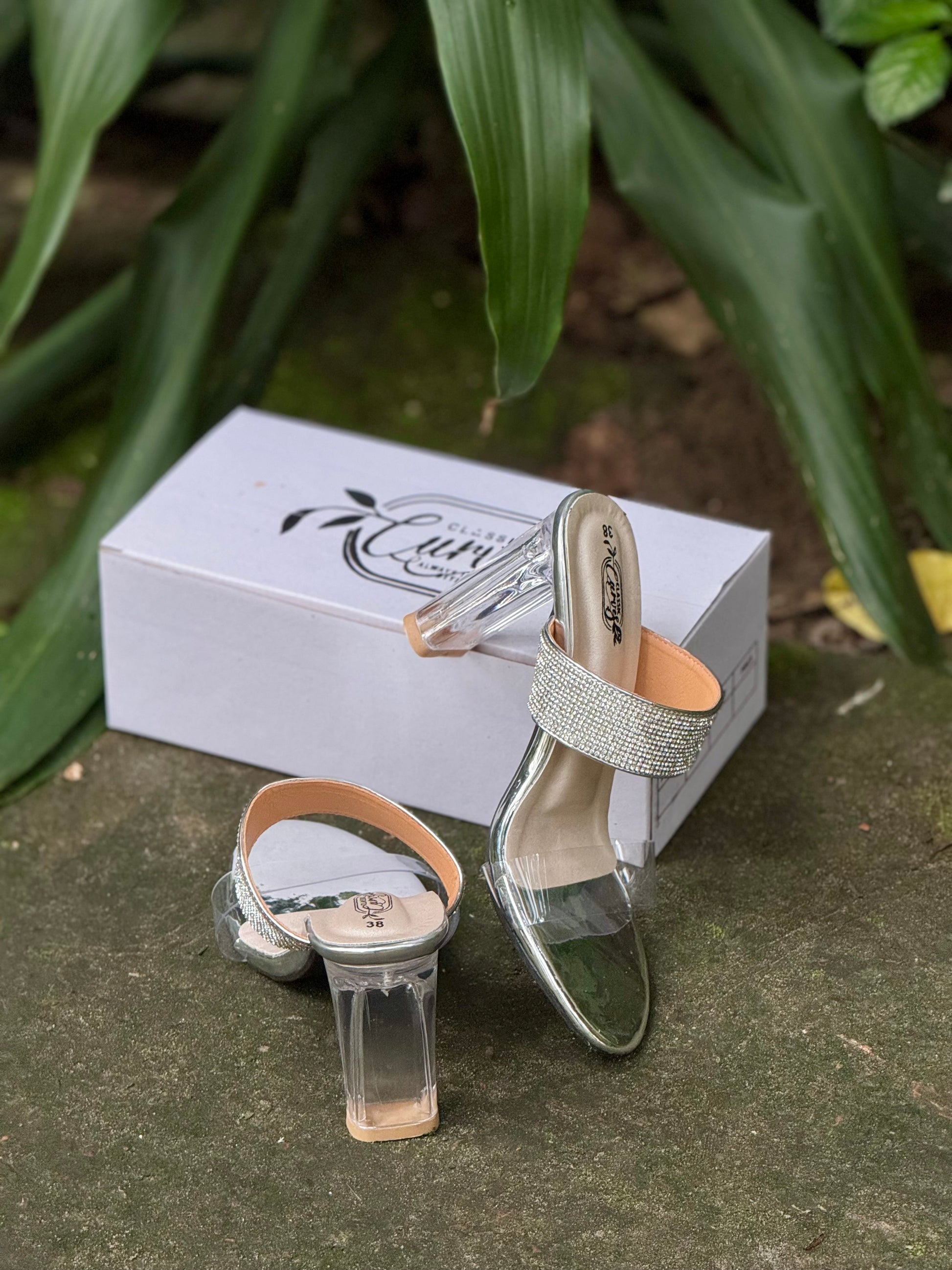 - Transparent glass-style heel for a sleek, modern look